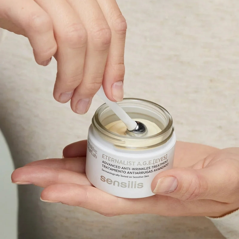 SENSILIS ETERNALIST A.G.E EYES X 20 ML.Crema reparadora para el contorno de los ojos con complejo revitalizante avanzado que corrige arrugas, reduce bolsas,ojeras y reafirma el párpado caído. Registro Invima:NSOC12603-22CO